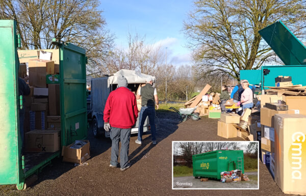 Vielen Dank an alle, die die angesetzte Annahmezeit von 8:00-12:00 Uhr auch einhalten. Es gibt leider jedes Mal wieder Leute, die das Papier schon am Freitag bringen, teilweise sogar schon bevor der Container überhaupt da ist. Wenn es dann in der Nacht regnet, müssen wir den Papier-Matsch bewegen und das Papier lässt sich auch im Container nicht mehr richtig stapeln. Auch nachträgliche Lieferungen am Samstag oder Sonntag sind leider nicht hilfreich.