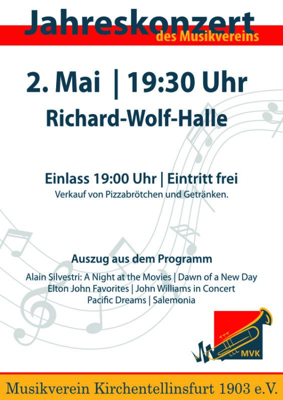 Wir laden herzlich ein zu unserem Jahreskonzert am 02. Mai 2026 um 19:30 Uhr in die Richard-Wolf-Halle in Kirchentellinsfurt. Der Einlass erfolgt ab 19:00 Uhr. Für das leibliche Wohl haben wir mit verschiedenen Pizzabrötchen und kühlen Getränken vorgesorgt.